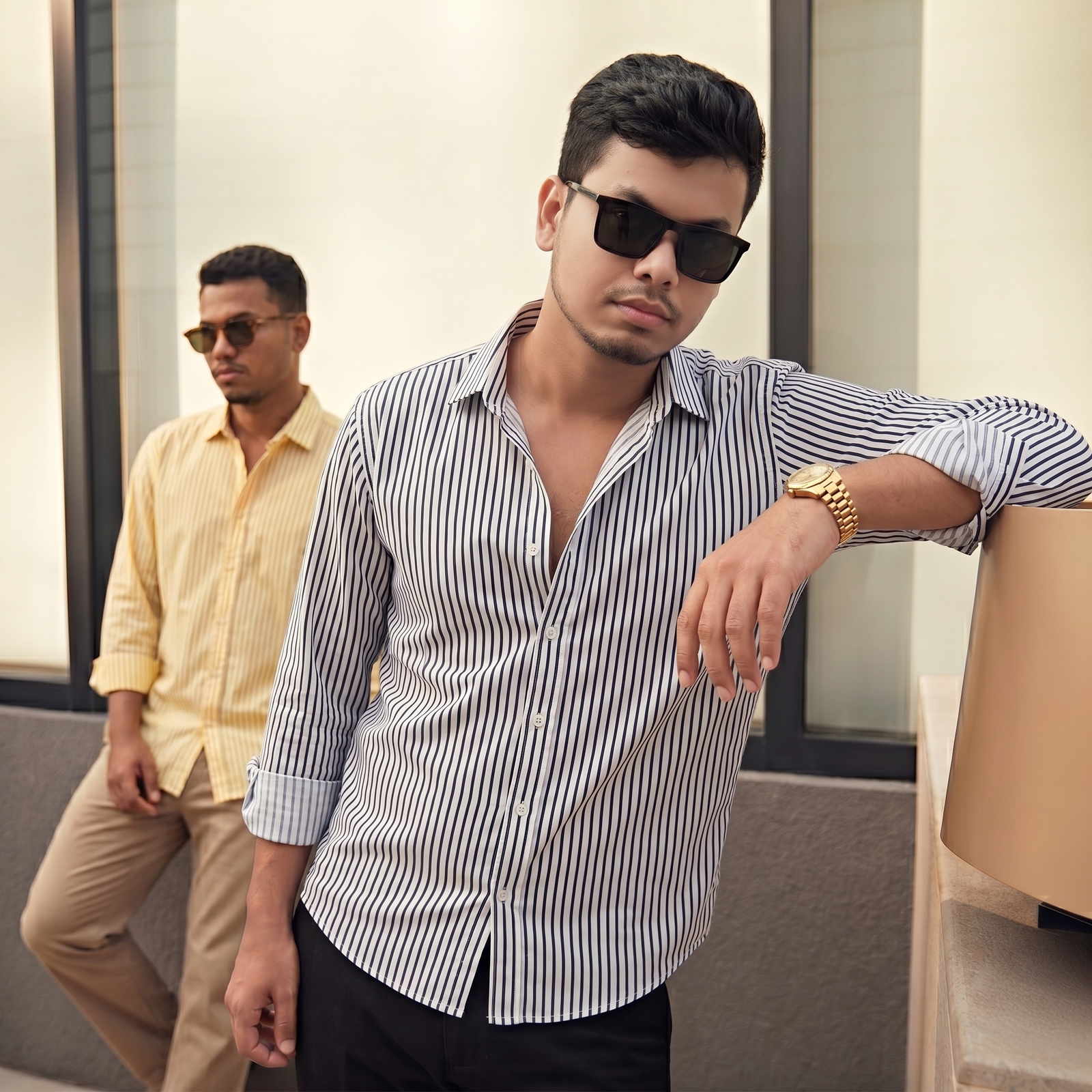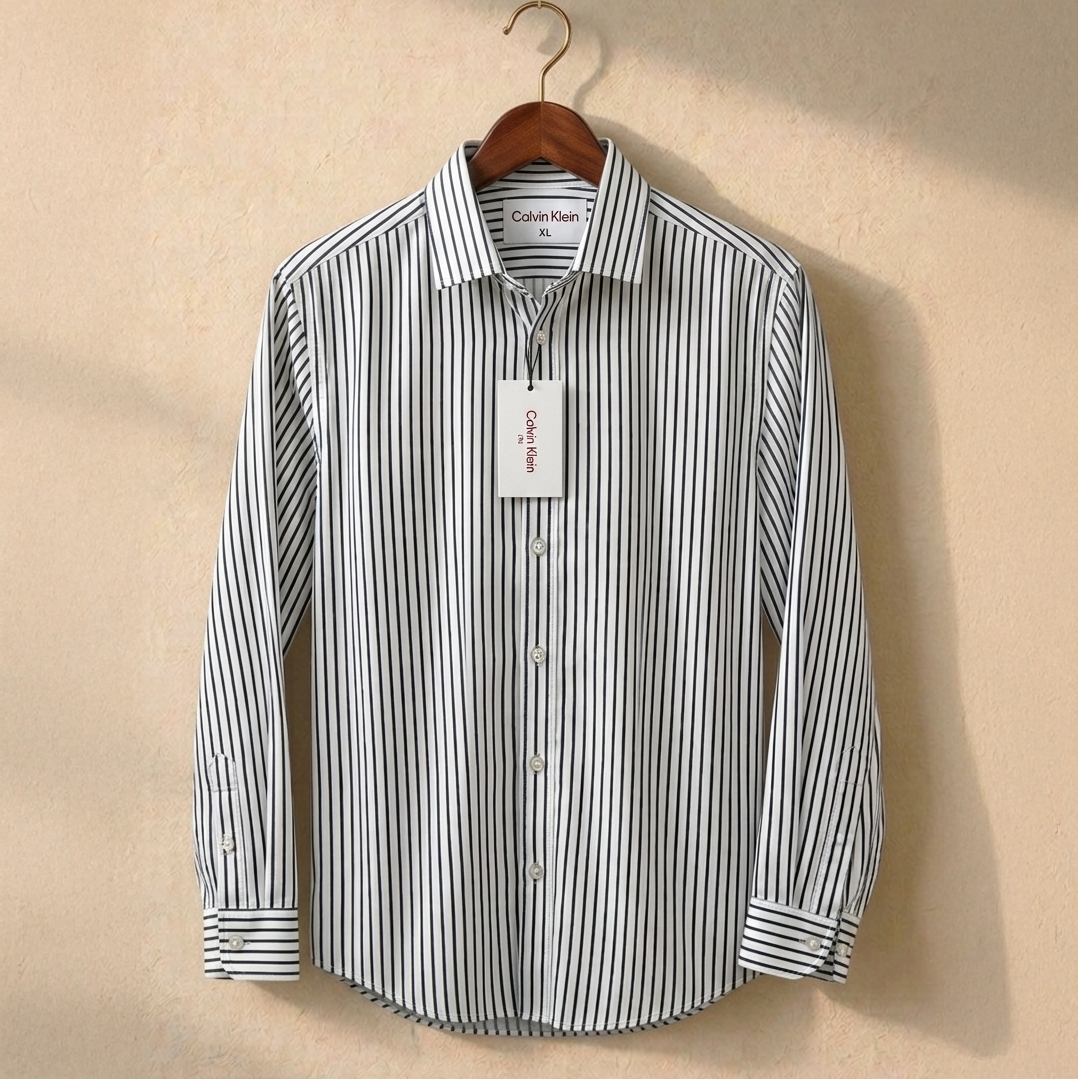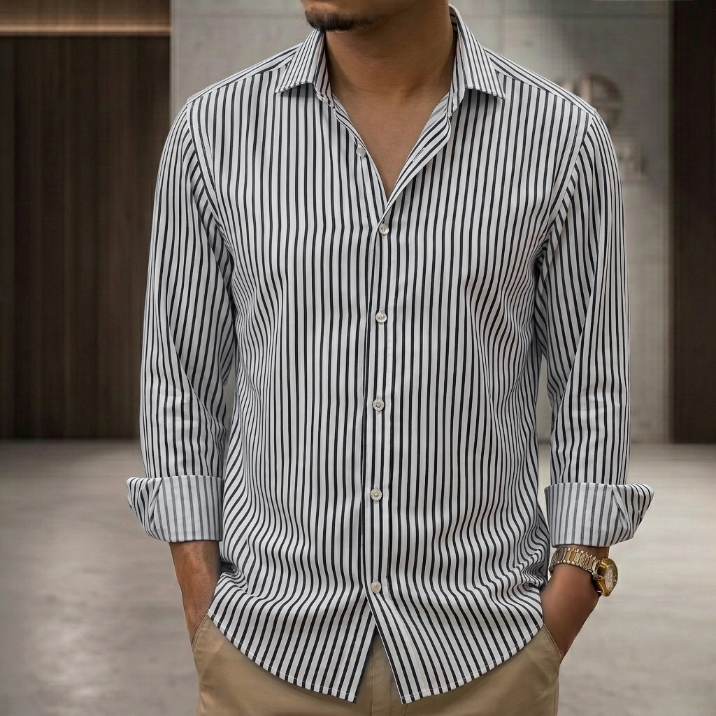 This classic striped button-down offers a sharp, tailored look that transitions effortlessly from the office to an evening out. The vertical pinstripe pattern creates a clean, elongated silhouette, while the refined collar and structured fit provide a sophisticated edge.